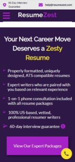 Who you work with: The ResumeZest team consists of Certified Professional Resume Writers (CPRWs) with backgrounds in HR, recruiting, and career coaching. Your writer is assigned based on your unique background and experience ensuring you work with someone familiar with your line of work.